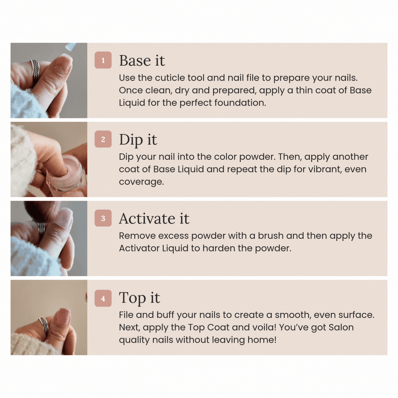 I was intimidated to try dip powder, but the instructions made it so easy. I watched one video and got the hang of it right away. Now I do my nails at home every two weeks and actually enjoy it.